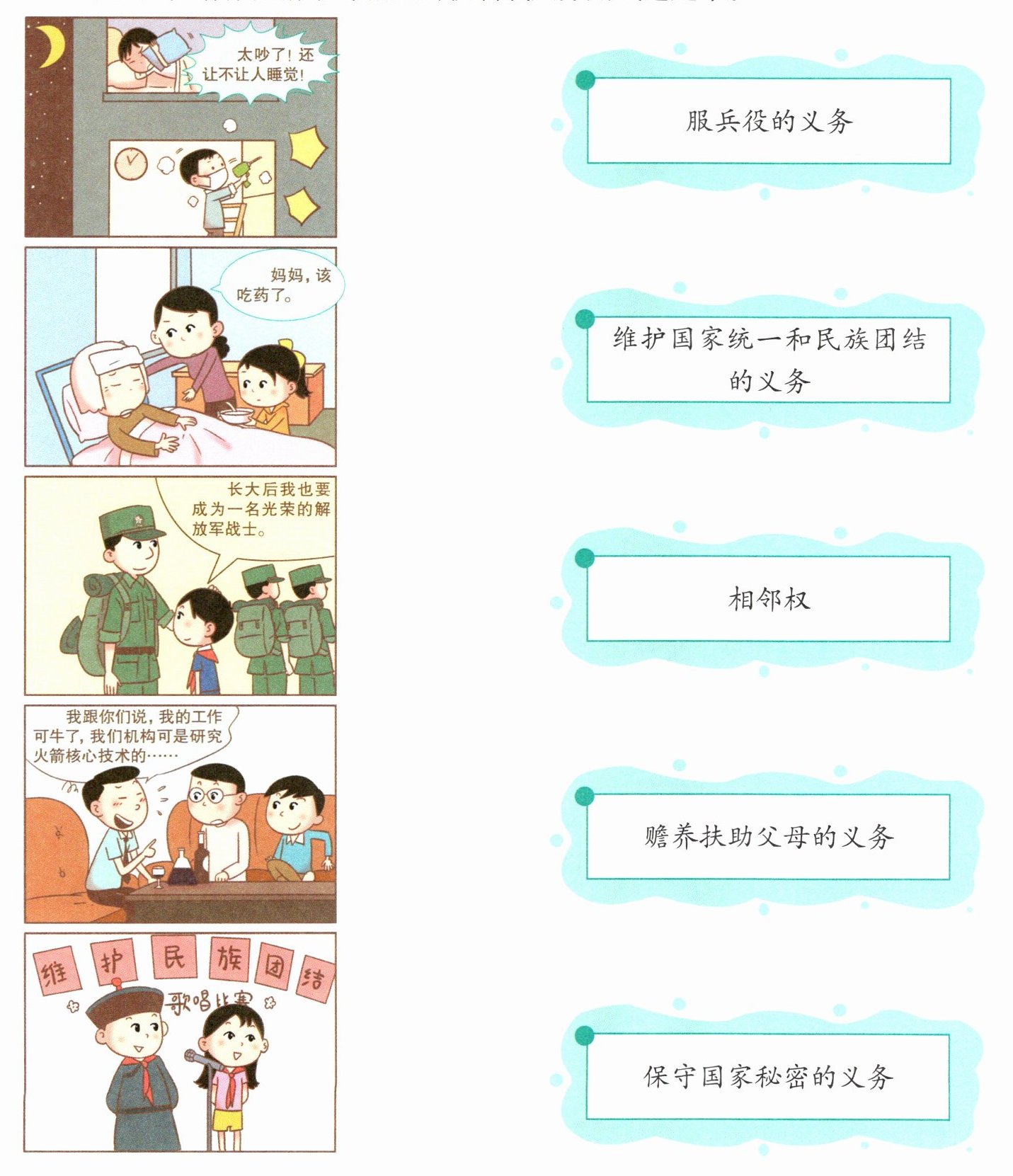 第一幅图-相邻权;第二幅图-赡养扶助父母的义务;第三幅图-服兵役的义务;第四幅图-保守国家秘密的义务;第五幅图-维护国家统一和民族团结的义务