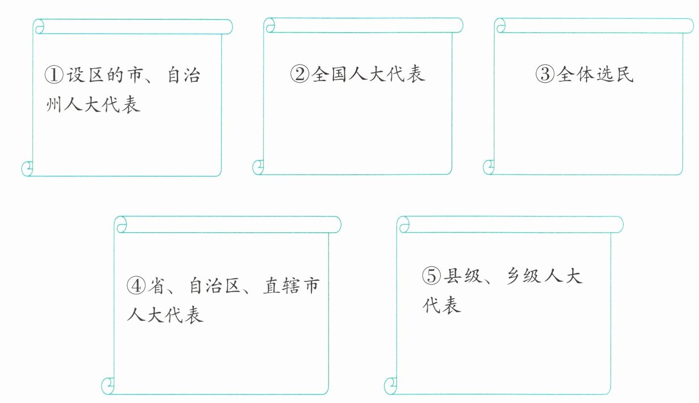 在爸爸的帮助下,文文了解到了全国人大代表是如何一步步选举产生的。你能给以下选举的步骤正确排序吗?请把序号按顺序填在对应的括号里。