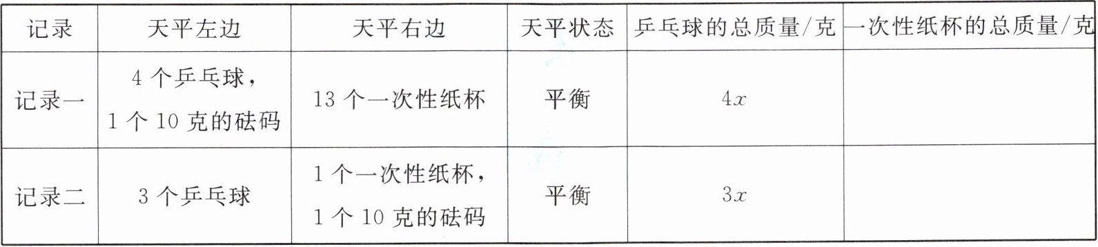 (2)由题意得4x+10=13(3x-10),解得x=4,所以3x-10=2(克)。所以一个乒乓球的质量为4克,一个一次性纸杯的质量为2克。
