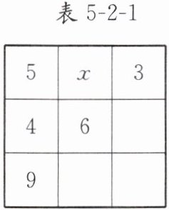 5. 把夏禹时代的“洛书”用数学符号翻译出来就是一个三阶幻方,它的每行、每列、每条对角线上的三个数之和均相等,那么在如表 5 - 2 - 1 所示的三阶幻方中 $x$ 的值为