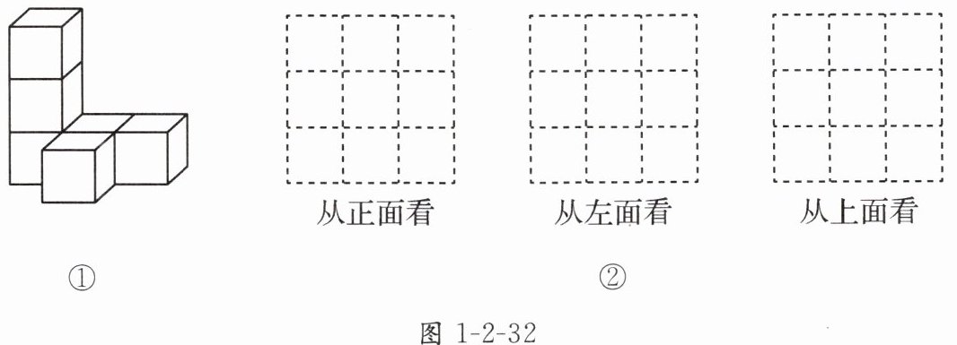 (2)请按要求在方格内(如图1-2-32②)分别画出从这个几何体的三个不同方向看到的形状图。