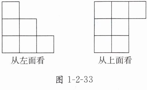 7. 一个几何体是由若干个大小相同的小立方体搭成的,从左面、上面看到的这个几何体的形状图如图1-2-33所示,它最多需要多少个小立方体?最少需要多少个小立方体?