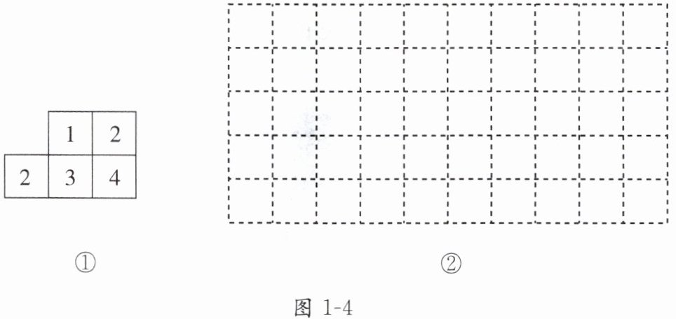 6. 一个几何体由一些大小相同的小立方块搭建而成,图 1 - 4①是从上面看到的这个几何体的形状图,小正方形中的数字表示在该位置的小立方块的个数,请在网格中(如图 1 - 4②)分别画出从正面和从左面看到的该几何体的形状图。