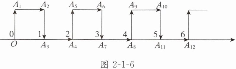 1. 在平面内,一只电子蚂蚁从数轴上表示原点的位置$O$点出发,按向上、向右、向下、向右的方向依次不断移动,每次移动$1$个单位长度,其移动路线如图$2 - 1 - 6$所示,第$1次移动到A_1$处,第$2次移动到A_2$处,第$3次移动到A_3$处,…$$,第$n次移动到A_n$处,则$\triangle OA_2A_{22}$的面积是