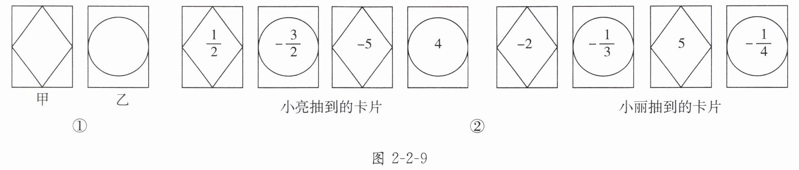 (2)比较两人所抽到的4张卡片的计算结果,结果大的为胜者。小亮和小丽玩这个游戏,他们抽到的卡片如图2-2-9②所示,请你通过计算说明本次游戏谁获胜。