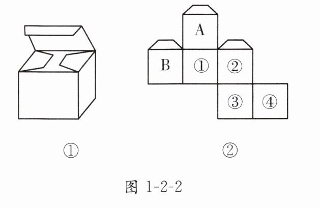 3. 图1-2-2①是一个粉笔盒,图1-2-2②是该粉笔盒的表面展开图,若字母A表示粉笔盒的上盖,B表示侧面,则底面在表面展开图中的位置是