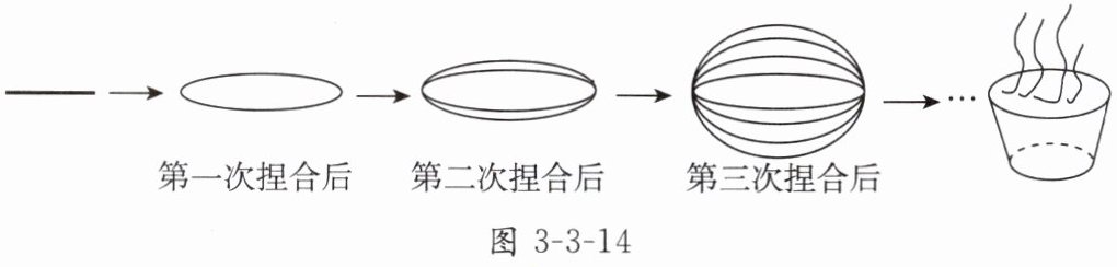 1. 【再现】你喜欢吃拉面吗?拉面馆的师傅用一根很粗的面条,把两头捏合在一起拉伸,再捏合,再拉伸,反复几次,就把这根很粗的面条拉成了许多根细的面条,如图 3 - 3 - 14。