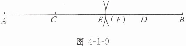 3. 如图4-1-9,点C,D是线段AB上两点($ CD > AC $,$ CD > BD $),用圆规在线段CD上截取$ CE = AC $,$ DF = BD $,若点E与点F恰好重合,$ AB = 10 $,则CD的长度是