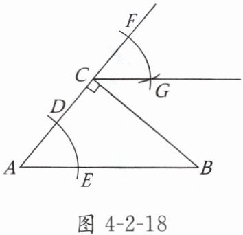 5. 如图$4-2-18,∠ACB= 90^{\circ},$按如下步骤操作:①以点A为圆心,任意长为半径作弧,分别交AC,AB于D,E两点;②以点C为圆心,AD长为半径作弧,交AC的延长线于点F;③以点F为圆心,DE长为半径作弧,与前面的弧交于点G;④作射线CG。若$∠FCG= 50^{\circ},∠B$为_________$^{\circ}。$