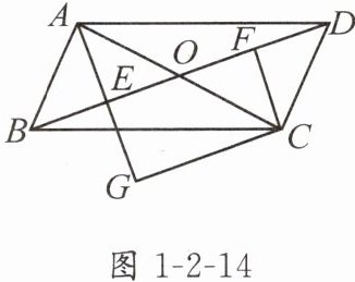 2. 如图 1-2-14,在平行四边形 $ABCD$ 中,对角线 $AC$,$BD$ 相交于点 $O$,点 $E$,$F$ 分别为 $OB$,$OD$ 的中点,延长 $AE$ 至点 $G$,使 $AE = GE$,连接 $CG$,$CF$。