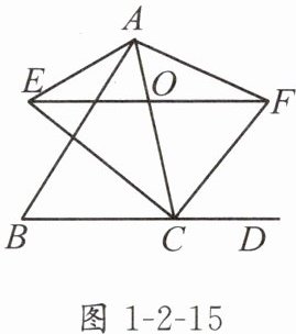 3. 如图 1-2-15,在 $\triangle ABC$ 中,点 $O$ 是边 $AC$ 上一个动点,过点 $O$ 作直线 $EF// BC$ 分别交 $\angle ACB$ 和 $\triangle ABC$ 的外角 $\angle ACD$ 的平分线于点 $E$,$F$。