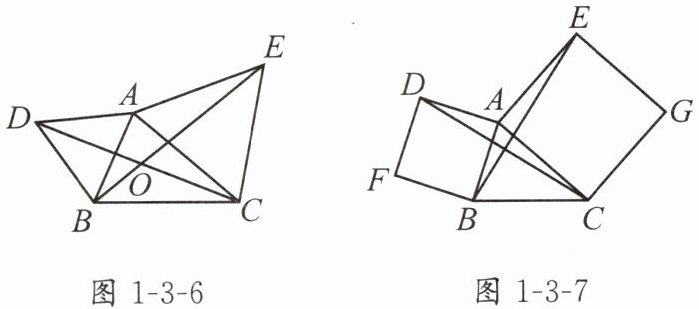 如图 1 - 3 - 6,在$\triangle ABC$ 中,小涵同学分别以 $AB$,$AC$ 为一边向三角形 $ABC$ 外作等边三角形 $ABD$ 和等边三角形 $ACE$.连接 $BE$,$CD$.这时他发现 $BE$ 与 $CD$ 的数量关系是