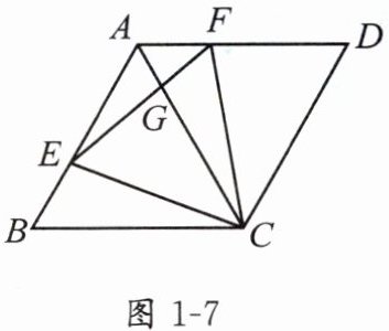 1. 如图1-7,在菱形 $ABCD$ 中,$\angle BAD = 120^{\circ}$,$AB = 4$,$E$,$F$ 分别是 $AB$,$AD$ 上的动点且 $BE = AF$,给出下列结论:① $\triangle BEC\cong\triangle AFC$;② $\triangle ECF$ 为等边三角形;③ $\angle AGE = \angle AFC$. 其中正确结论的序号有