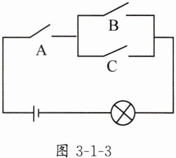 3. 如图 3 - 1 - 3,电路图上有三个开关 A,B,C 和一个小灯泡,当电路是通路时,小灯泡发光. 任意闭合其中两个开关,则小灯泡发光的概率等于