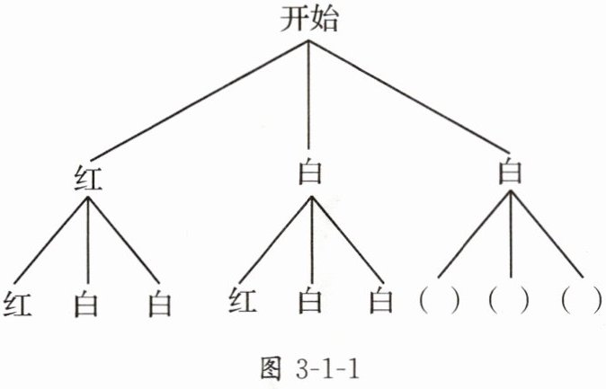 1. 在一个不透明的口袋中有一个红球和两个白球,它们除颜色外都相同. 任意摸出一个球,记下球的颜色,放回袋中;搅匀后再任意摸出一个球,记下球的颜色. 为了研究两次摸球出现某种情况的概率,画出如图 3 - 1 - 1 所示的树状图.