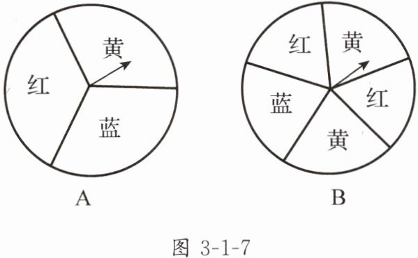 1. 如图3-1-7,转盘A,B是两个可以自由转动的均匀的转盘,其中转盘A被分成3个面积相等的扇形,转盘B被分成5个面积相等的扇形.用画树状图或列表的方法求转动两个转盘配成紫色的概率.(转动转盘,一个转盘转出红色,另一个转盘转出蓝色,则可配成紫色)