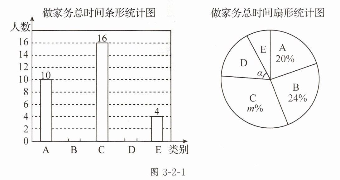 1. 勤劳是中华民族的传统美德,学校要求学生在家做一些力所能及的家务.在学期初,小丽同学随机调查了七年级部分同学寒假在家做家务的总时间,设被调查的每名同学寒假在家做家务的总时间为 $ x $ h,将做家务的总时间分为五个类别:A($ 0 \leq x < 10 $),B($ 10 \leq x < 20 $),C($ 20 \leq x < 30 $),D($ 30 \leq x < 40 $),E($ x \geq 40 $),并将调查结果绘制成了如图 3 - 2 - 1 所示的两幅不完整的统计图.