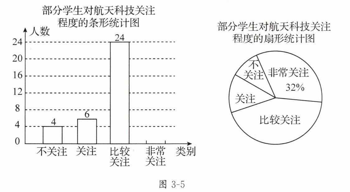 3. 国家航天局消息:北京时间 2022 年 4 月 16 日,搭载翟志刚、王亚平、叶光富 3 名航天员的神舟十三号载人飞船返回舱在东风着陆场成功着陆,这 3 名航天员圆满完成这次航天任务. 某中学科技兴趣小组为了解本校学生对航天科技的关注程度,在该校内进行了随机调查. 将调查结果分为不关注、关注、比较关注、非常关注四类,回收、整理好全部调查问卷后,得到不完整的统计图(如图 3 - 5):