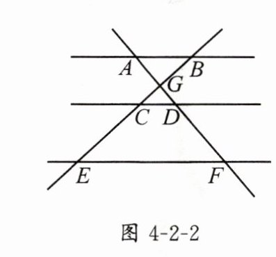 2. 如图 4-2-2,$ AB // CD // EF $,$ AF $ 与 $ BE $ 相交于点 $ G $,$ AG = 2 $,$ GD = 1 $,$ DF = 5 $,则 $ BC:CE = $