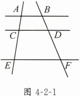 1. 如图 4-2-1,已知直线 $ AB // CD // EF $,$ BD = 2 $,$ DF = 4 $,则 $ \frac{AC}{AE} $ 的值为(