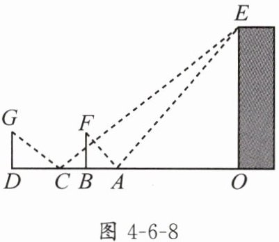 3. 如图4-6-8,为了测量一栋楼OE的高度,小明同学先在操场上A处放一面镜子,向后退到B处,恰好在镜子中看到楼的顶部E;再将镜子放到C处,然后后退到D处,恰好再次在镜子中看到楼的顶部E(O,A,B,C,D在同一条直线上),测得AC=2m,BD=2.1m,如果小明眼睛距地面的高度BF,DG均为1.6m,试确定楼OE的高度.