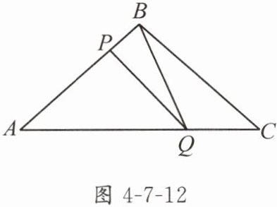 3. 如图4-7-12,在$\triangle ABC$中,$BA = BC = 20\mathrm{cm}$,$AC = 30\mathrm{cm}$,点$P$从点$A$出发沿$AB$边以$4\mathrm{cm/s}$的速度向点$B$运动,同时点$Q$从点$C$出发沿$CA$边以$3\mathrm{cm/s}$的速度向点$A$运动,其中一个动点到达端点时停止运动,另一个也相应停止运动,设运动时间为$x\mathrm{s}$.