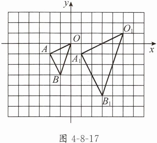 3. 在如图4-8-17所示的方格纸中,$\triangle OAB$的三个顶点分别为$O(0,0)$,$A(-2,-1)$,$B(-1,-3)$,$\triangle O_1A_1B_1$与$\triangle OAB$是以点$P$为位似中心的位似图形.