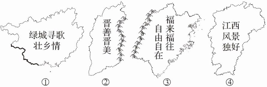 我国不同省级行政区宣传语各具特色,读我国四个省级行政区轮廓图和宣传语,完成下列各题。