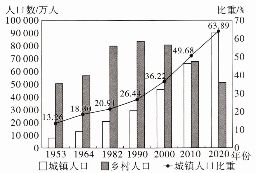 (3)变化特点:城镇人口比重逐年上升,乡村人口比重逐年下降(城镇人口增加,乡村人口减少)。不利影响:劳动人口减少,耕地撂荒;留守儿童和空巢老人增多;等等。