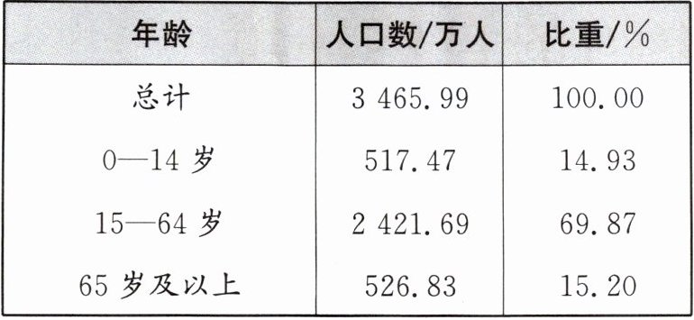 根据国际标准,一个国家或地区60岁及以上人口占总人口比重达到10%,或65岁及以上人口占总人口比重达到7%,即标志该国家或地区进入老龄化社会。下表是第二组同学搜集到的2023年山西省常住人口年龄结构数据。
