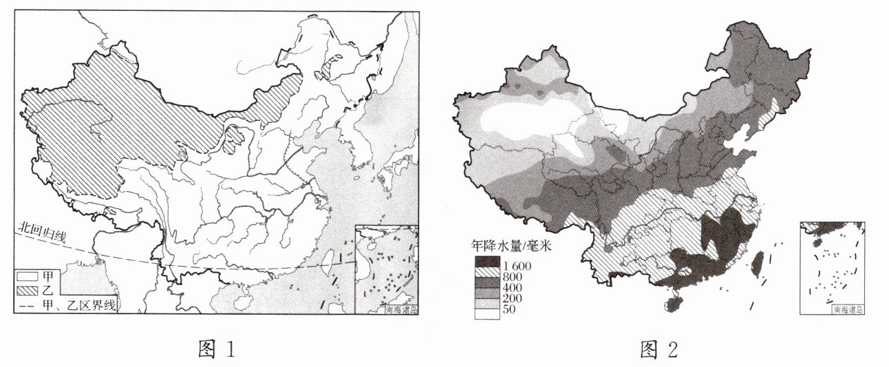(1)甲、乙两区河流水量占全国河流总水量的比重差异大,据图分析原因。