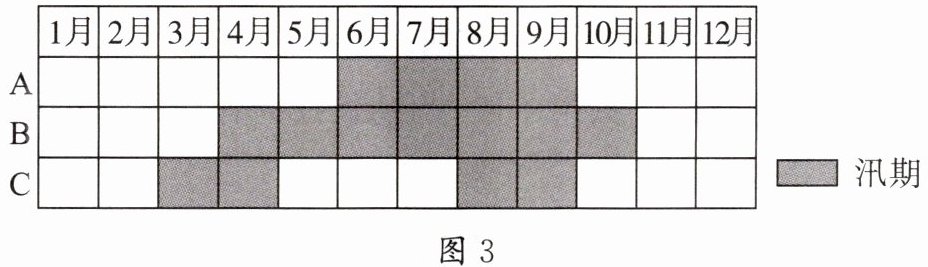 (2)题,我国东部地区,南方雨季长,北方雨季短,造成河流汛期自南向北缩短,珠江是我国汛期最长的河流,对应图3中B河;松花江有两个汛期,对应图3中C河;A河是长江。第