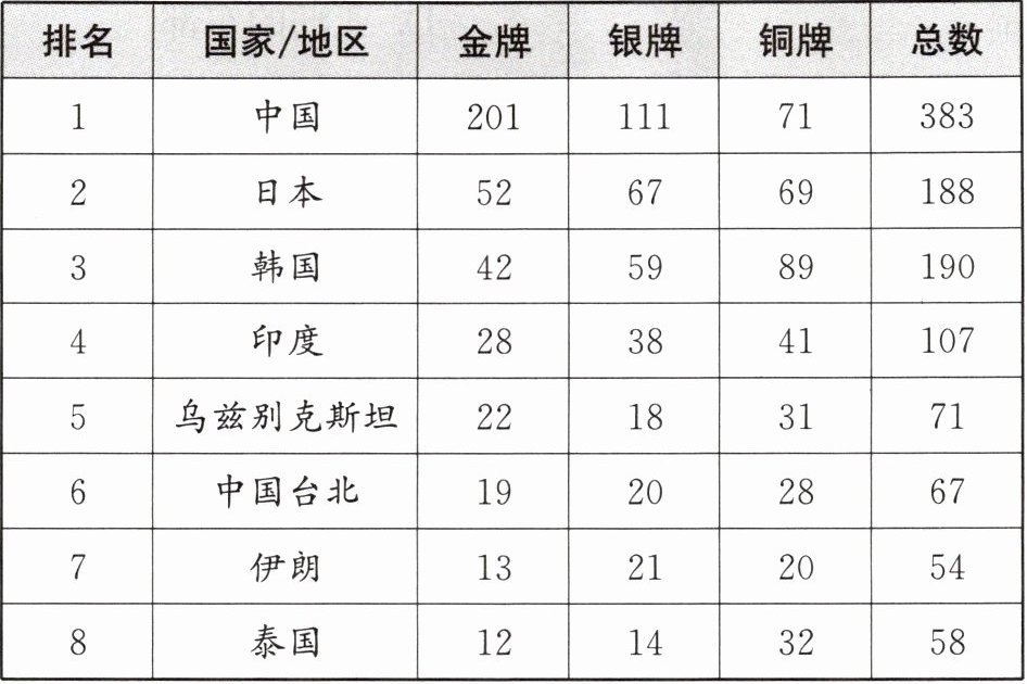 在杭州第19届亚运会中,中国体育代表团获得201金111银71铜,共383枚奖牌,取得亚运会参赛历史最好成绩,位居亚运会金牌榜榜首。下表为本届亚运会奖牌榜(部分),据此完成7~8题。