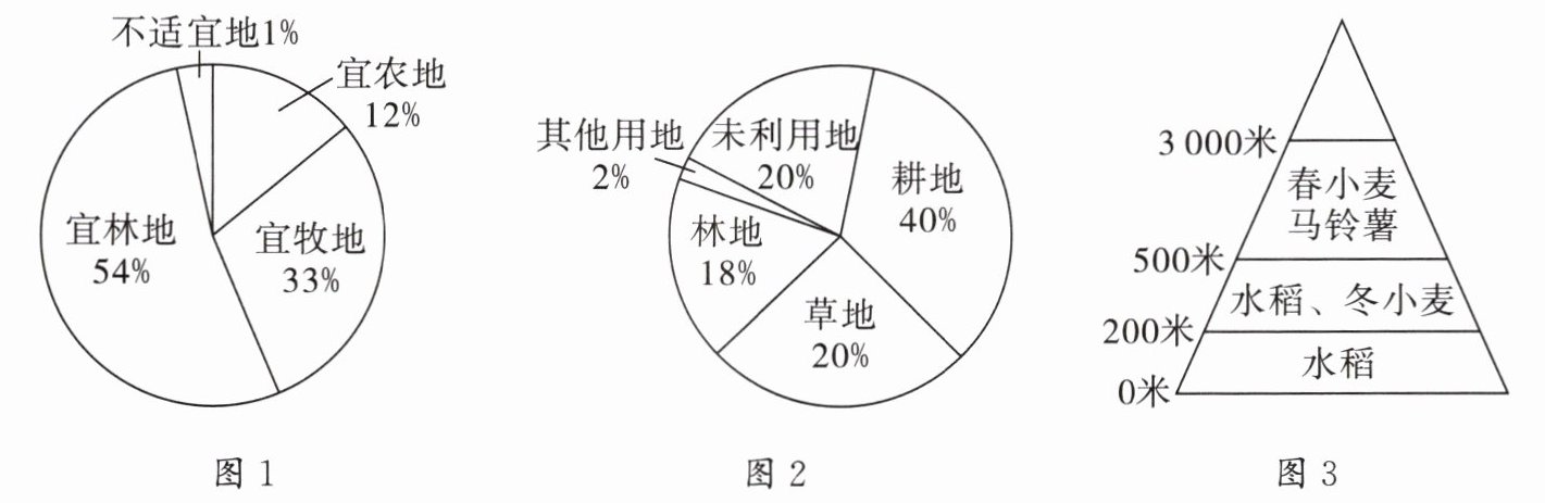 图 1 为我国某地区土地资源构成图,图 2 为该地区土地利用构成图,图 3 为该地区粮食作物垂直分布图。读图,完成 7~8 题。