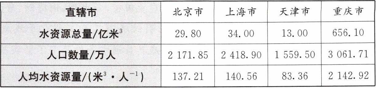 (2024·福建中考)我国四个直辖市的水资源存在差异。下表示意某年四个直辖市的水资源与人口状况。读表,完成 6~7 题。