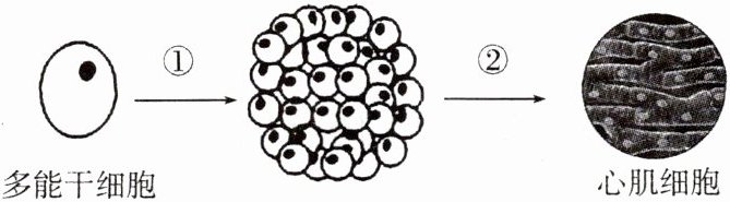 (1)图中①过程表示细胞分裂,其结果是细胞____;②过程表示____,细胞的结构、形态和功能向着不同的方向变化,最终形成心肌细胞。①②说明干细胞具有____的能力。