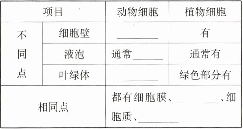 某生物学兴趣小组在学完植物细胞和动物细胞的结构后,决定利用列表法来比较两者的相同点和不同点。分组探究,完成下列活动。