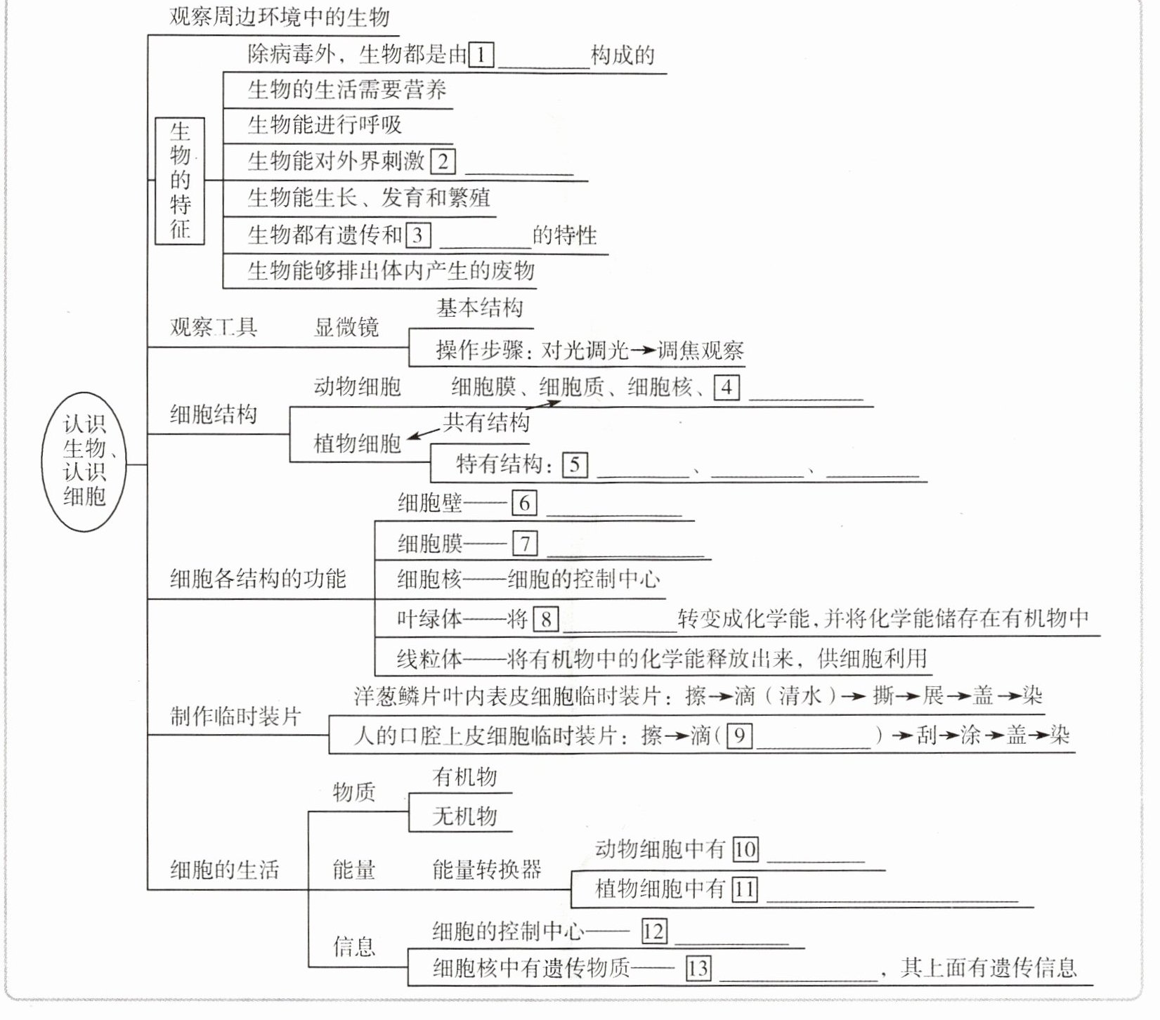 1 细胞 2 作出反应 3 变异 4 线粒体 5 细胞壁 液泡 叶绿体 6 保护和支持 7 控制物质进出 8 光能 9 生理盐水 10 线粒体 11 线粒体和叶绿体 12 细胞核 13 脱氧核糖核酸