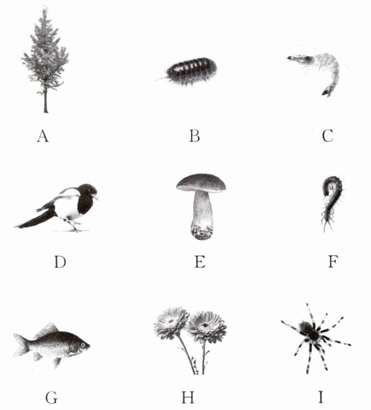 (2)生活在水中的生物有______,生活在阴暗的陆地环境中的生物有______。(填字母序号)
