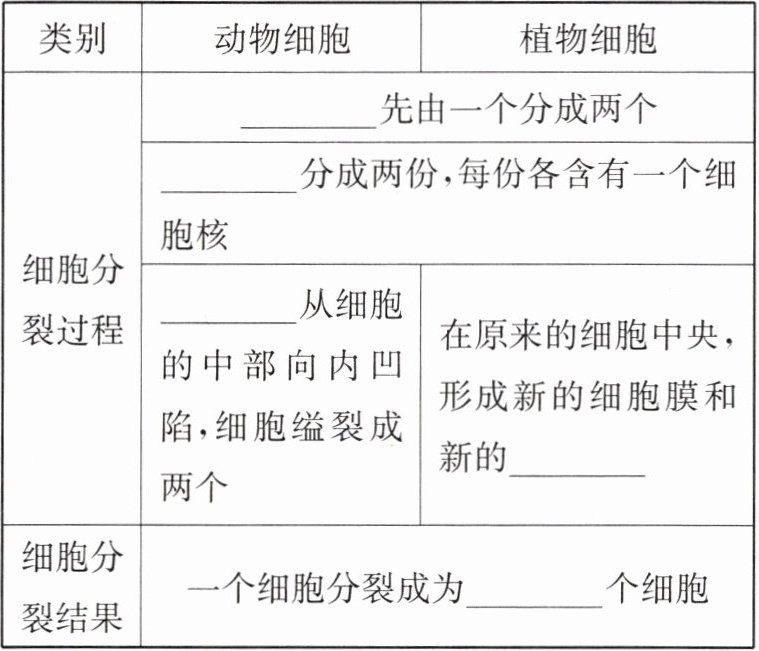 | | 细胞膜从细胞的中部向内凹陷,细胞缢裂成两个 | 在原来的细胞中央,形成新的细胞膜和新的细胞壁 |