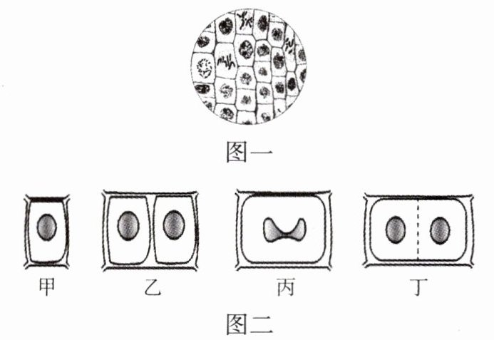 11. 图一是显微镜下洋葱根尖细胞分裂的图像;图二是小红观察到洋葱根尖细胞的分裂过程后绘制的示意图,请据图回答下列问题。