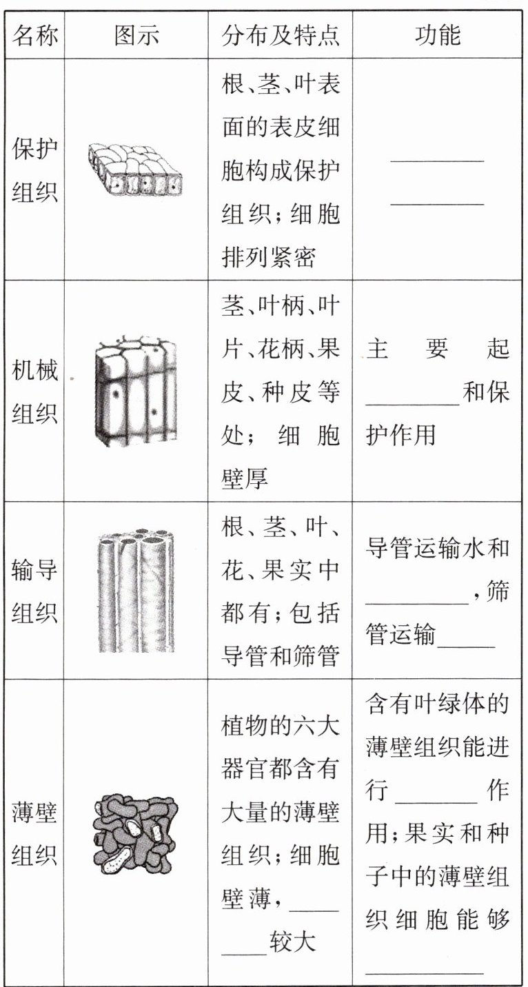 |机械组织||茎、叶柄、叶片、花柄、果皮、种皮等处;细胞壁厚|主要起____和保护作用|