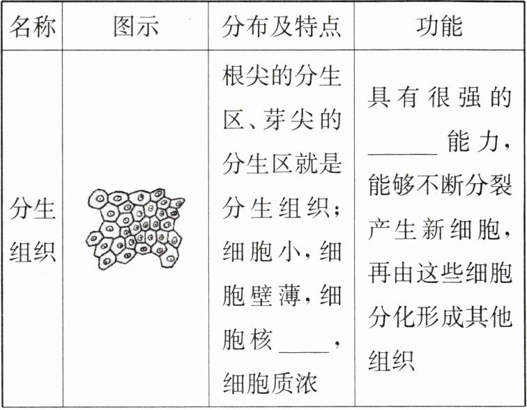 |分生组织||根尖的分生区、芽尖的分生区就是分生组织;细胞小,细胞壁薄,细胞核____,细胞质浓|具有很强的____能力,能够不断分裂产生新细胞,再由这些细胞分化形成其他组织|