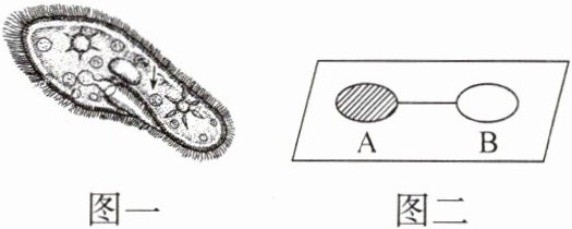 ②草履虫靠______运动,在载玻片的液滴中加少许棉花纤维,目的是______。显微镜下观察到的草履虫如图一所示。发现它体内某种结构被染成了红色(图中箭头所示),该结构最可能是______。