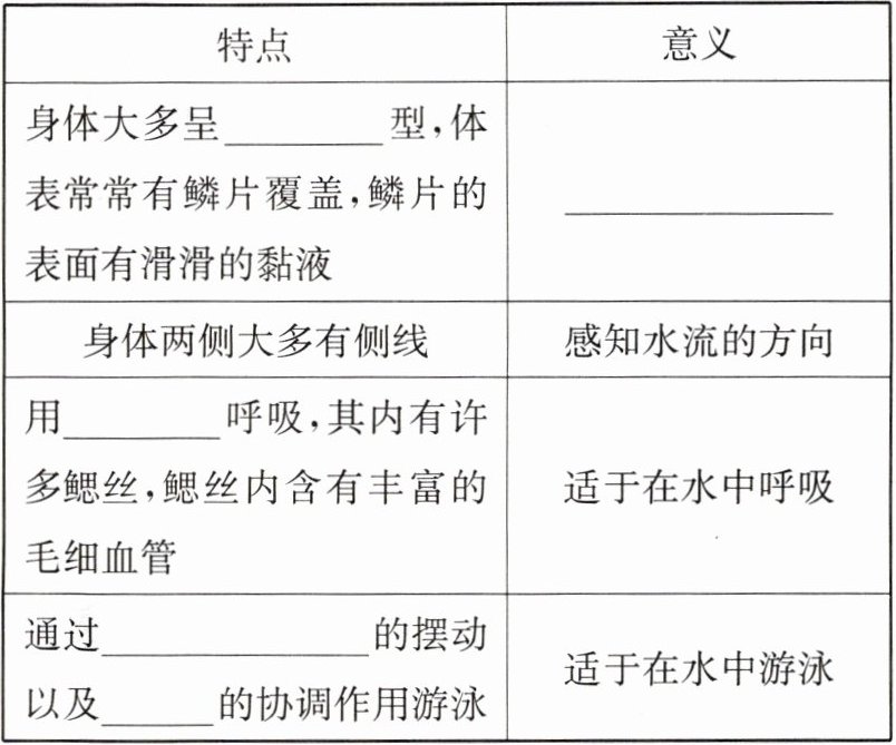 |身体大多呈______型,体表常常有鳞片覆盖,鳞片的表面有滑滑的黏液|______|