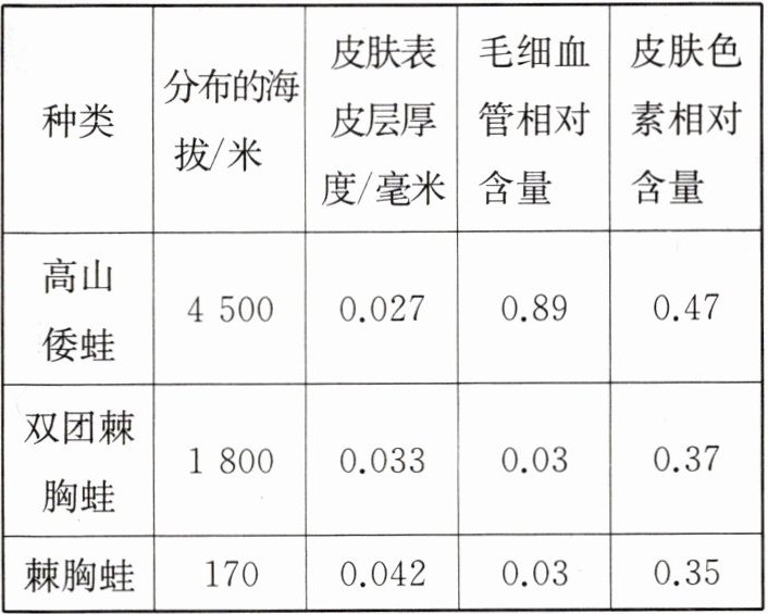 (2)研究人员采集与高山倭蛙亲缘关系较近的分布在不同海拔的蛙类进行相关研究,结果如表所示,请根据表中信息回答问题。