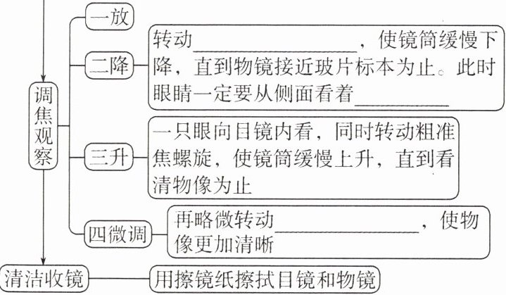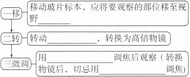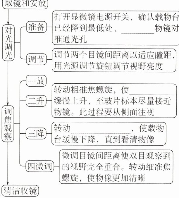 请仔细阅读课本 P14~P15 内容,在阅读的过程中,圈画出关键词句。阅读完成后独立思考并完成下面的显微镜使用步骤流程图。