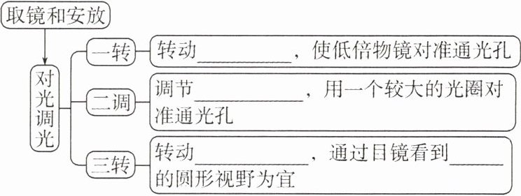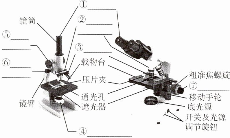 请仔细观察课本 P13“图 1 - 11 光学显微镜”,完成下面的图示。
