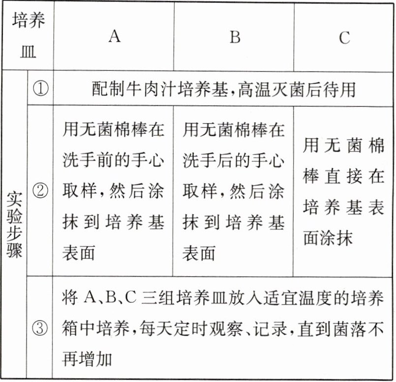 | |③|将 A、B、C 三组培养皿放入适宜温度的培养箱中培养,每天定时观察、记录,直到菌落不再增加|