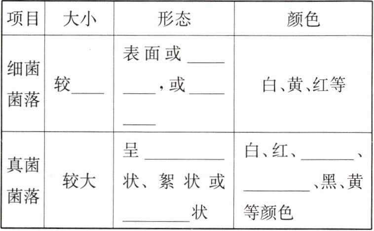 |细菌菌落|较____|表面或____,或____|白、黄、红等|